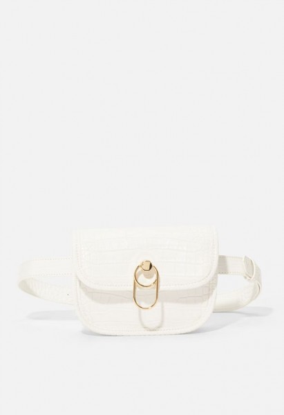 Material: Faux Leather Size: 7”L x 4.5”H x 2.5”D Hardware color: Gold Belt strap measurements: 31.5" to 46" Adjustable Strap Pockets: 1 interior pocket, 1 interior zip Closure: Magnetic snap